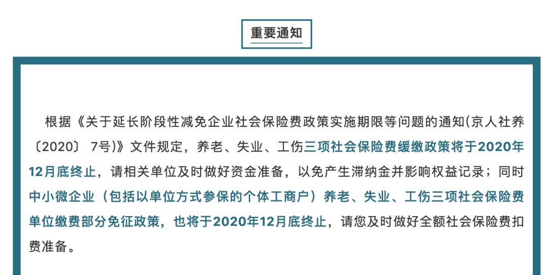 根据《关于延长阶段性减免企业社会保险费政策实施期限等问题的通知(京人社养〔2020〕 7号)》文件规定,养老、失业、工伤三项社会保险费缓缴政策,以及中小微企业三项社保费单位缴费部分免征政策将于2020年12月底到期终止。